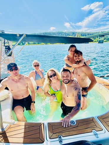 Launching from our brand new dock near the Spokane River outlet, you will soon find yourself surrounded by the beauty of Coeur d’Alene. Take in the mountain views, glide along the beaches, anchor in a secluded inlet, gaze at the famous Coeur d’Alene Resort or check out the waterfront mansions in the Riverstone Community…all while soaking in your private Spacruzzi hot tub boat!